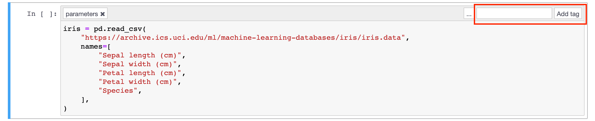 We need to make a small change in our Jupyter notebook to allow Dagster to supply the iris_dataset asset as input. Behind the scenes, Dagster uses papermill to inject parameters into notebooks. papermill works by replacing a notebook cell with the parameters tag with a custom cell that can fetch the desired data.