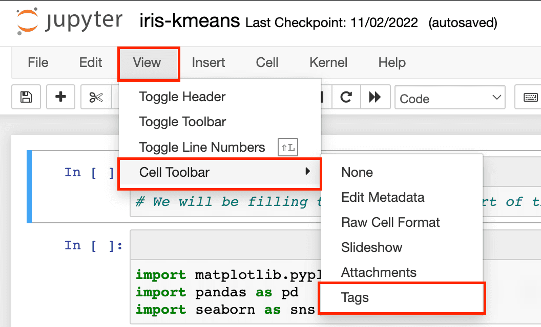 To accomplish this, we need to tag the cell in the iris-kmeans notebook that fetches the Iris dataset. This allows us to replace the cell with the data-fetching logic that loads the iris_dataset asset and retain the ability to run the Jupyter notebook in a standalone context. We'll cover this in more detail later in the tutorial.
